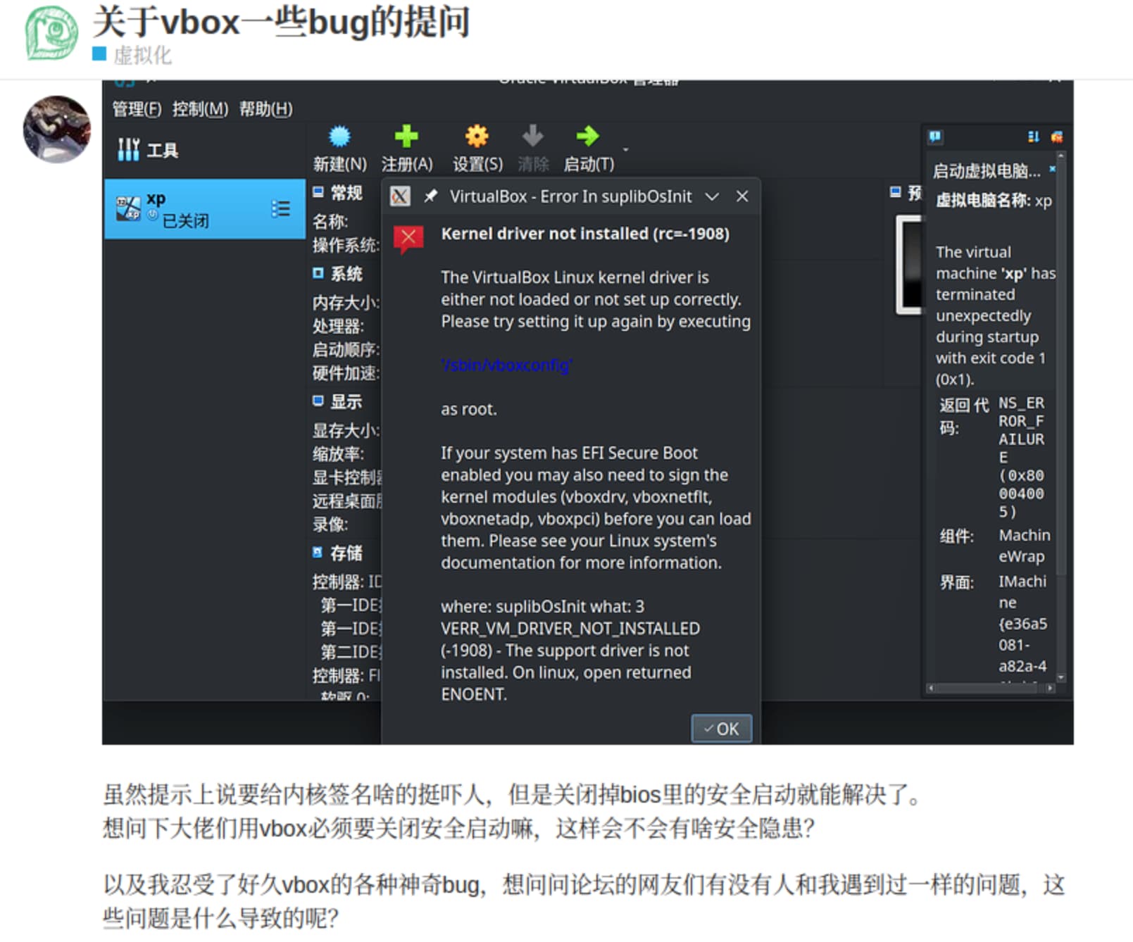 可以试试将软件源更新至最新状态,从 openSUSE 官方仓库安装最新版本的 VirtualBox。如果还有此,问题,可根据报错弹窗提示文本关闭安全启动,手动执行报错信息指定的脚本。